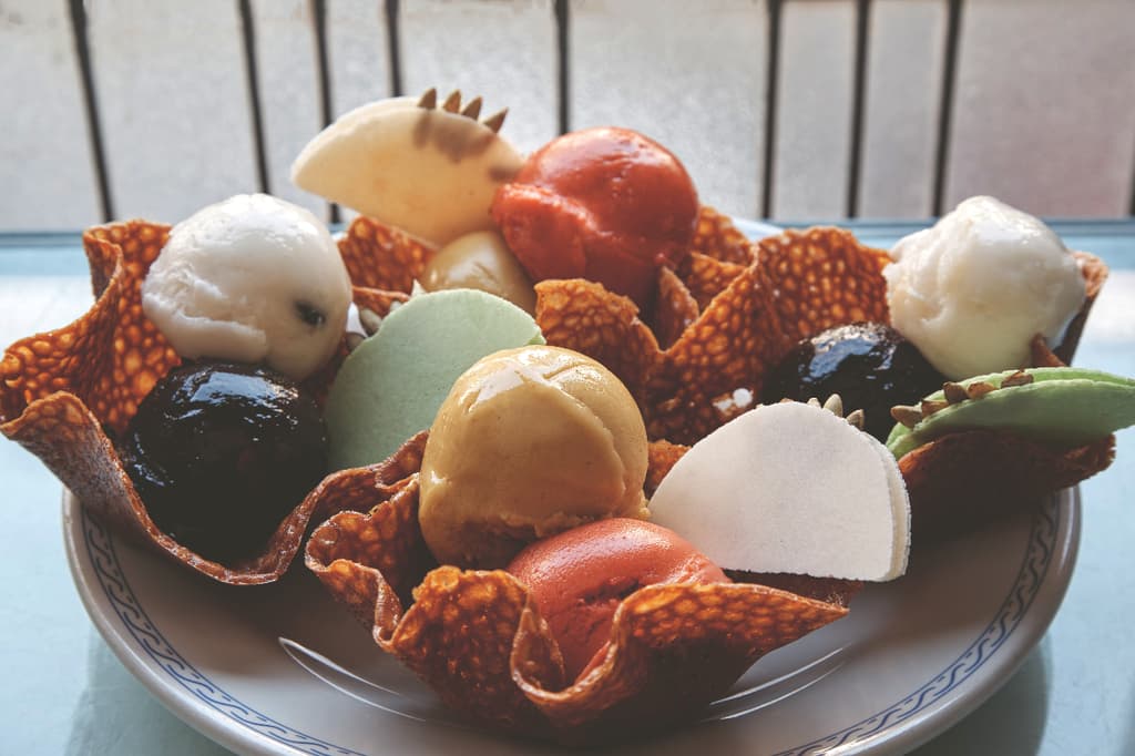 A mediodía, la película cambia de tono sin abandonar la estirpe. Entran a escena el queso tapado, los escamoles cuando hay temporada, la sopa de verdolagas con pollo, el fideo seco al chipotle, la pechuga en mole poblano y las nieves mexicanas que sirven de cierre.