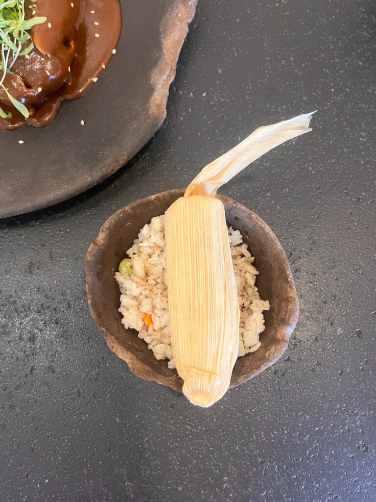 En su carta fija está el icónico oaxaqueňo de mole negro y el de de masa colada estilo chiapaneco con huevo duro, alcaparras, aceitunas, plátano y guajolote. Acompáñese de mezcal.