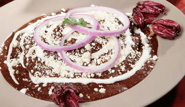 Las enmoladas de Pan Comido están hechas con mole vegano que ellos mismos preparan, sustituyendo el caldo de pollo por caldo de frijol y el chocolate por cocoa. El relleno tiene plátano macho, papa, zanahoria rallada y flor de jamaica que blanquean con un toque de piloncillo. Éstas están decoradas con crema, queso cotija, cebolla morada y un poco de cilantro fresco.