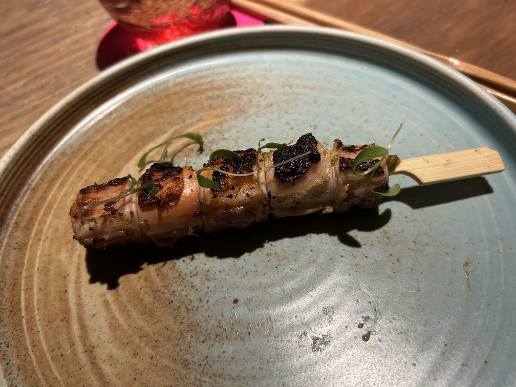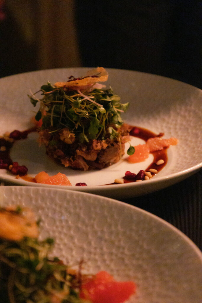 Del menú, estos dos fueron lo mejor. Una brocheta de pulpo robata, bien sazonada con ponzu de chile poblano rostizado, y la ensalada de pato crujiente, con toronja, granada, piñones y echalot.