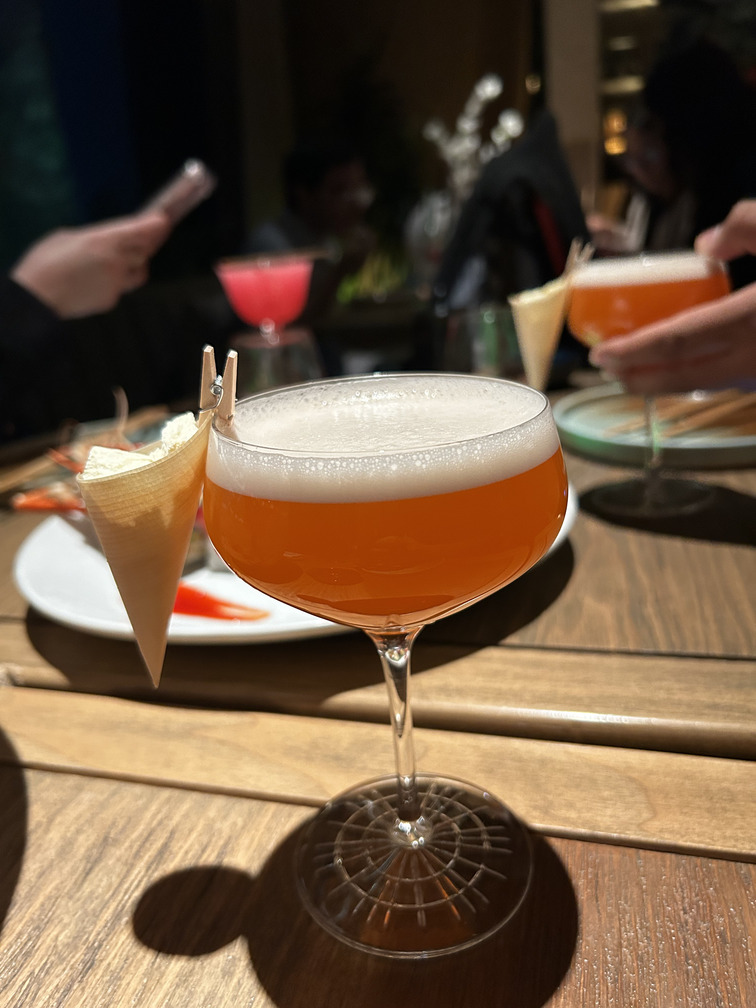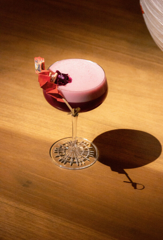 El Tianlong lleva Macallan 12 años, St.Germain, reducción de betabel con canela, aquafaba y bitter de chocolate. Es dulce dulce y se adorna con un dragón que se quema antes de probarlo.