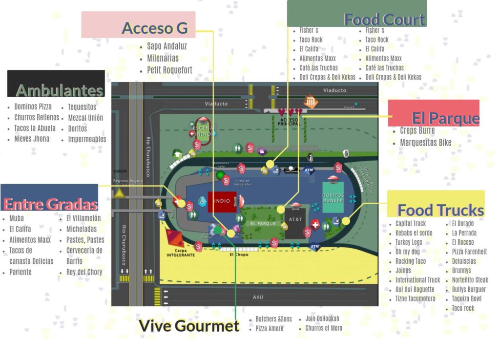 Gracias al interés de los visitantes en la edición del 2018, las propuestas gastronómicas serán muy diversas, pues habrá diferentes opciones de servicio en los diferentes espacios del Foro Sol: estarán los ambulantes, los locales entre gradas, una zona de food trucks, una zona gourmet y una zona food court.