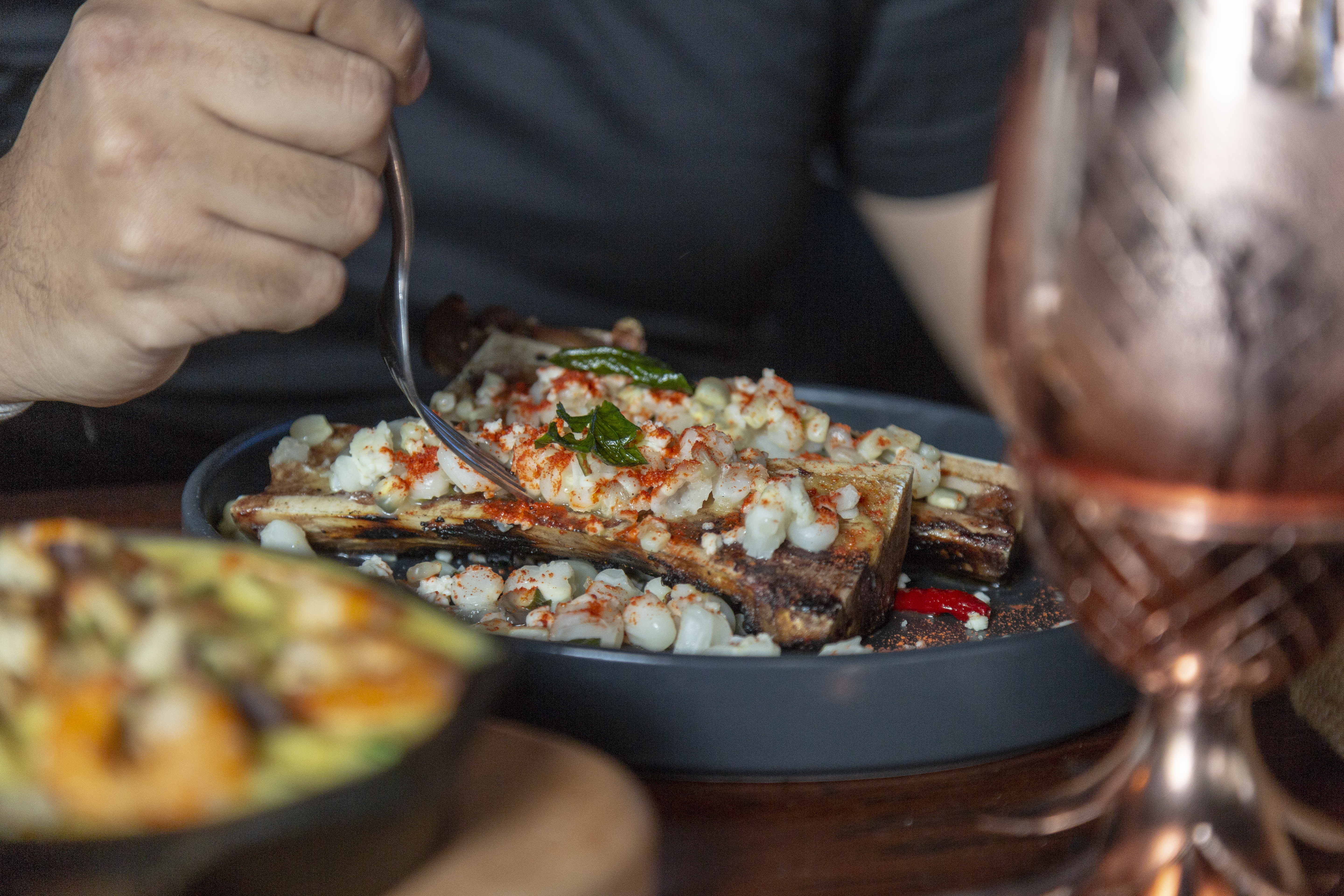 Hay platillos que destacan de la mayoría, escoger alguno en Food Trade Center es difícil, pues tendrías que ir a comer diario por tres meses para poder probar su amplia carta. Puedes intentar (como nosotros) probando algo diferente de cada país. Empezar con dos entradas (documentación les dicen acá): un dúo de tuétanos ($165) –acompañado de esquites de tres granos–, pintxo vasco ($82) –queso gorgonzola, salmón ahumado y pera–, pintxo ibérico ($98) –jamón jabugo, manzana verde y alioli de alcachofa.