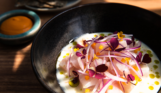 Pero su gran fuerte son las entradas –divididas entre montaditos, crudos y sliders–, en las que sobresale el cuidado del producto y el respeto en la ejecución: el tataki de atún, por ejemplo, es carnoso y tiene personalidad. Aunque creo, con firmeza, que la gran estrella de este menú es el ceviche peruano: servido en un pla- to hondo (primer acierto), con una dosis abundante de leche de tigre –cítrica, marina y floral– que terminas a cucharadas (segundo acierto) y cubos de pescado que se complementan en untuosidad con una guarnición de camote amarillo (tercer acierto). Debo decir que este plato realmente emociona y que, probablemente, sea el mejor ceviche peruano que he probado en la ciudad.