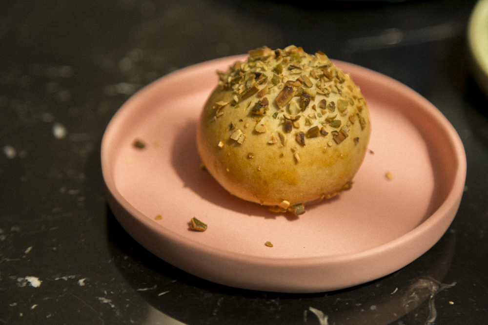 Hay mucha pomposidad en el menú (encontrarás frases como “joyería vegetal”), pero muchos de sus platos son menos adornados y más profundos en sabor, como la lengua de res confitada con pipián verde y ensaladita de tomate verde, quelites, hierbas varias y pepitas. Es vegetal y aromática al mismo tiempo que cárnica y potente. Hay tortillas para taquear y no dejar una gota de ese pipián en el plato; aunque también hay pan de suero de queso y pepita, y de mantequilla de maíz con requesón vegano.