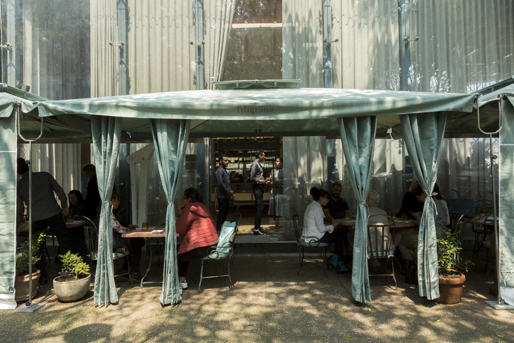 El restaurante Filigrana es brillante. En serio, brilla: los cristales biselados de su fachada en cuchilla le dan un aspecto como de diamante urbano, con verdísimas jardineras y una terracita preciosa casi salida de Pinterest. Por dentro está lleno de detalles que compiten entre sí: sillones morados, un árbol, techo de cobre, uniformes de alta costura, vajilla de cerámica colorida y un imponente mural, fragmento de la obra que Rafael Cauduro inauguró en 2014 ahí mismo.