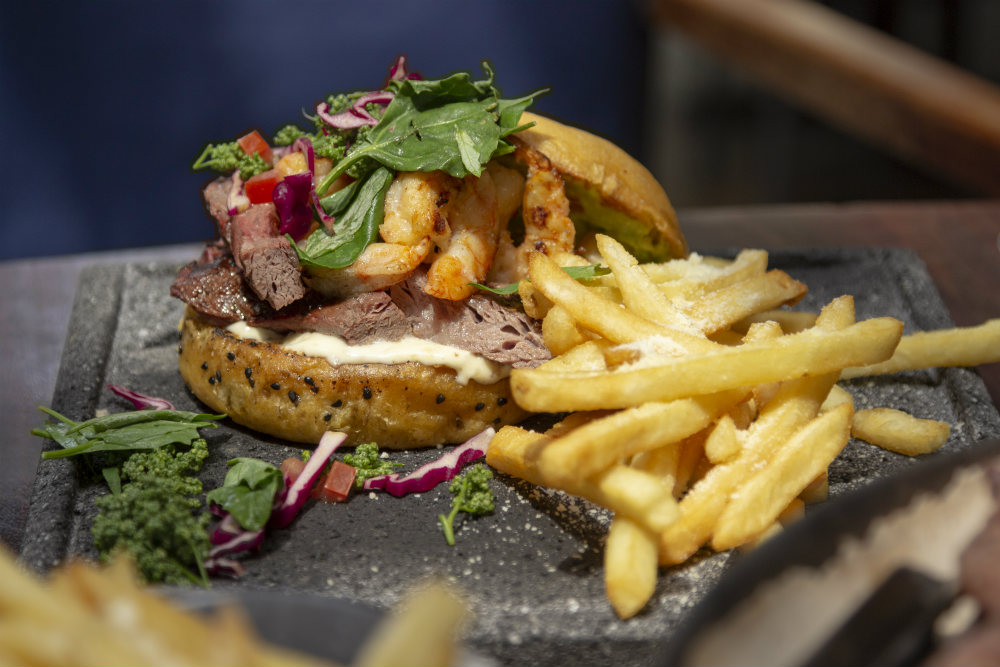 Para el plato fuerte no dudes, elige la hamburguesa mar y tierra, con steak de camarón, arrachera al grill, guacamole, queso asadero y ensalada de quelites; va con papas fritas espolvoreadas con parmesano.