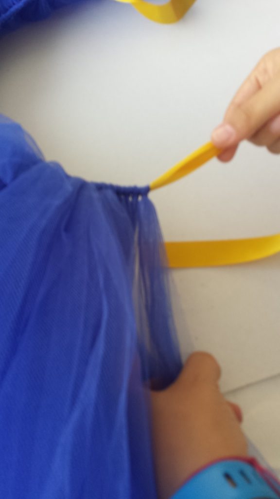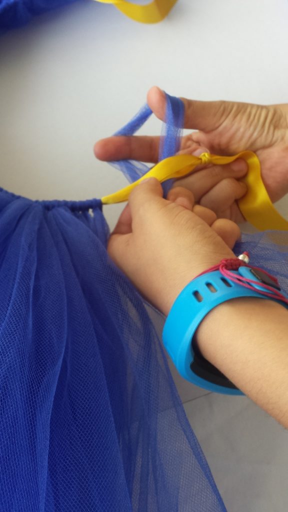 - Amarra cada tira de tul al listón juntándolas para que tenga mas volumen el tutu hasta llegar al otro nudo.