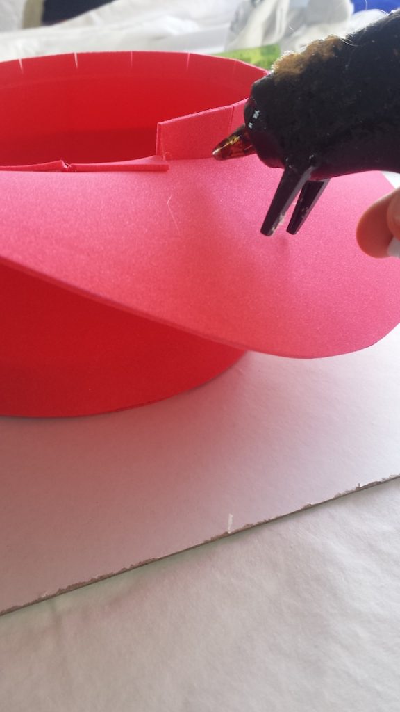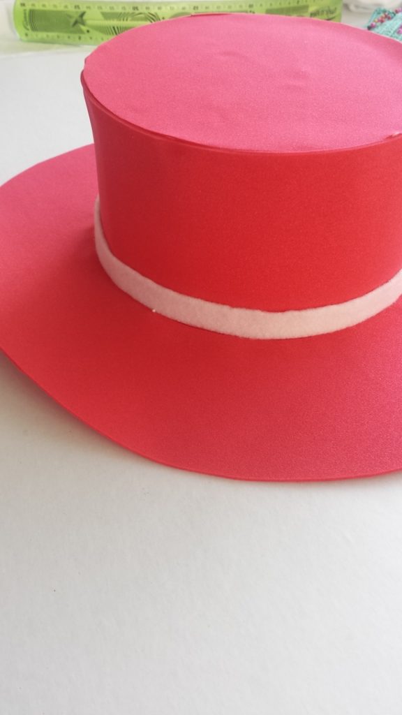 - Corta una tira de tela blanca de 52 cm por 1 cm de ancho y pega en la base del sombrero como detalle del mismo.