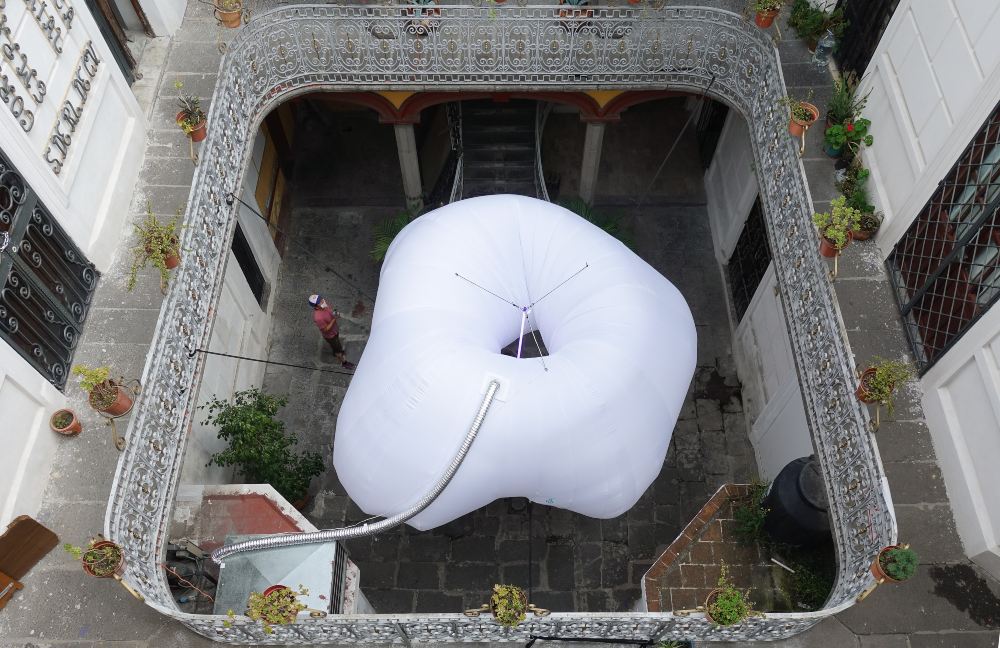A simple vista parece un inflable, pero en realidad se trata de una escultura neumática diseñada a manera de túnel que conecta el espacio físico con la imaginación.