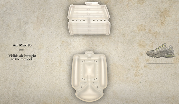 En ese momento, los Air Max 1, los Air Max 180 y los Air Max 90 tenían unidades Air-Sole en la parte delantera del pie pero estaban totalmente encapsulados y no se podían ver. A medida que continuaba la búsqueda de un calzado para correr sin espuma, un gran descubrimiento tuvo lugar. Este llegó como una nueva forma de construcción para las Air-Soles llamado “moldeo por soplado”. Primero se utilizó en los Air Max 93, esta técnica permitió la creación de Air-Soles en formas tridimensionales que no eran dependientes de la presión del aire. Esto significaba que las Air-Soles podían diseñarse para adaptarse a la curvatura del pie. El pleno aprovechamiento de la innovación, los Air Max 95, consistía en dos Air-Soles individuales moldeadas por soplado, fue la primera manifestación de aire visible en la parte delantera del pie.
