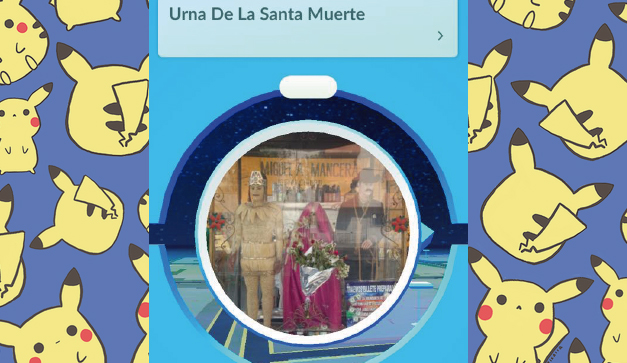 Sabes que vives en el mero barrio, cuando la pokeparada está en la urna de la Santa Muerte. AY NANITA.