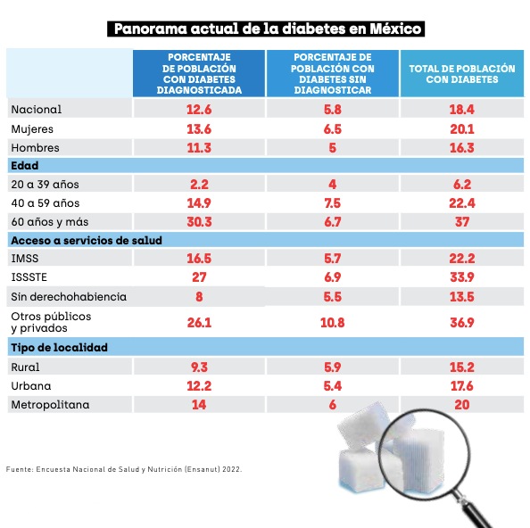 A nivel nacional, los estados con más población diabética son Campeche, Hidalgo y Tamaulipas. El Instituto de Seguridad y Servicios Sociales de los Trabajadores del Estado (ISSSTE), que atiende en mayor medida a personas adultas mayores, es una de las instituciones de salud con más afiliados diabéticos. De la población con diabetes en México, 33.9% es derechohabiente del ISSSTE; 22.2% cuenta con IMSS; 36.9% recibe atención médica en servicios privados o en públicos de otro tipo, y 13.5% no tiene afiliación en ninguna institución de salud, según datos de la Ensanut 2022.