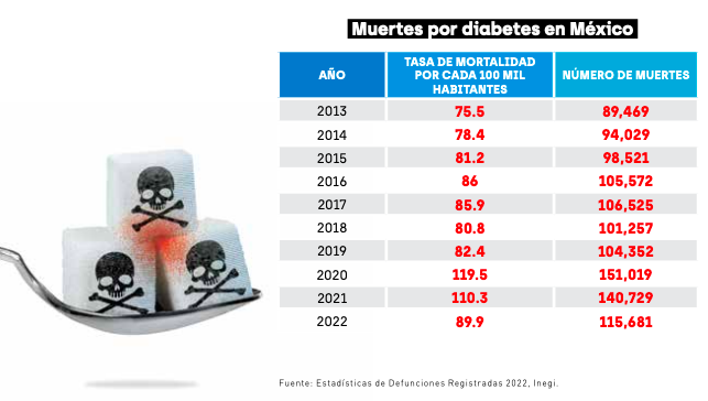 Hasta el momento, la tasa de mortalidad por diabetes crece paulatinamente. Para 2019 se ubicó en 82.4. En 2020 y 2021, como consecuencia indirecta de la pandemia de COVID-19, que generó un exceso de muertes en otros padecimientos que fueron desatendidos durante la emergencia sanitaria, los decesos por diabetes se dispararon a 119.5 y 110.3 por cada 100 mil habitantes.