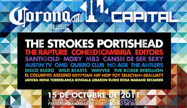 El otrora conocido como "festival de la curva" fue anunciado oficialmente. El Festival Corona Capital 2011 se llevará a cabo el próximo 15 de octubre en la curva 4 del Autódromo Hermanos Rodríguez, con más de 12 horas de música ininterrumpidas, 4 escenarios, arte, cultura y 30 bandas de diversos géneros. La preventa Banamex para el Corona Capital será este 15 y 16 de junio a través del sistema Ticketmaster.
