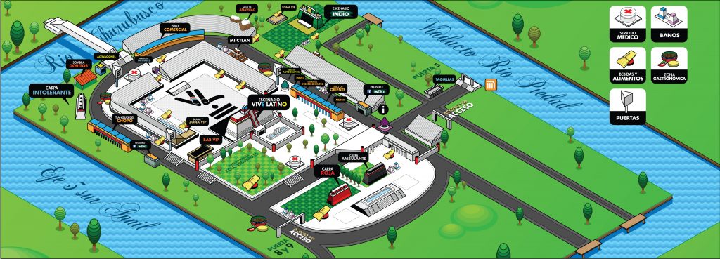 Aquí el bonito mapa del festival que le muestra dónde estarán los escenarios, las áreas de comida, baños, servicio médico y demás. No se confíen, cambiaron la distribución de los escenarios así que chéquenlo antes de llegar al festival.