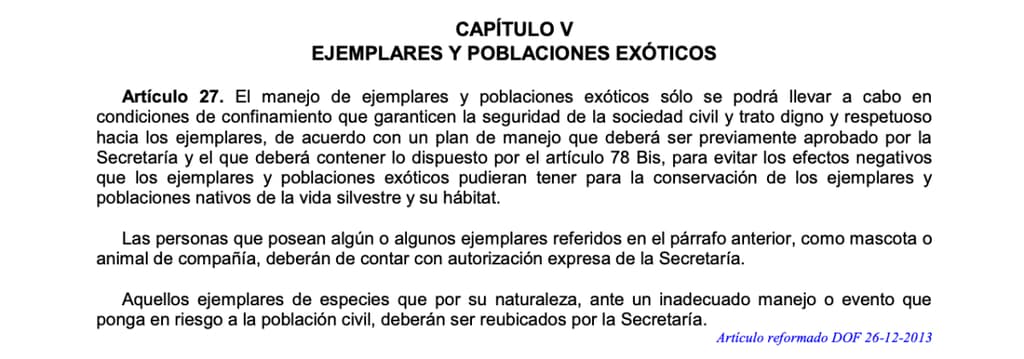 Según el artículo 27 de la Ley General de Vida Silvestre las personas que tengan un animal exótico como mascota deberán estar en condiciones de “confinamiento”, esto quiere decir que, sólo se pueden mantener dentro del hogar que habiten y no pueden salir a la calle. Con finalidad de “evitar efectos negativos para los ejemplares y poblaciones nativos de la vida silvestre y su hábitat”.