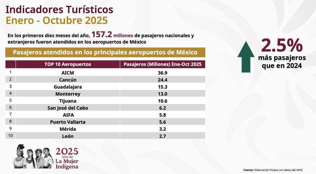 De acuerdo con datos de la Secretaría de Turismo, presentados durante la conferencia matutina de este jueves, en los primeros diez meses del año los aeropuertos del país atendieron 157.2 millones de pasajeros nacionales y extranjeros, un incremento de 2.5% respecto al mismo periodo de 2024.