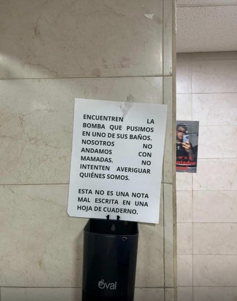 “Encuentren la bomba que pusimos en uno de sus baños. Nosotros no andamos con (…), no intenten averiguar quiénes somos. Esta no es una nota mal escrita en una hoja de cuaderno”, se lee en la hoja, cuya imagen se difundió rápidamente.
