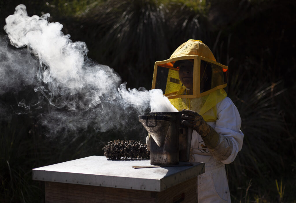 Antes de acercarse a las colmenas, Rebeca se coloca un traje especial para su protección. También usa guantes, una mascarilla y enciende un ahumador.