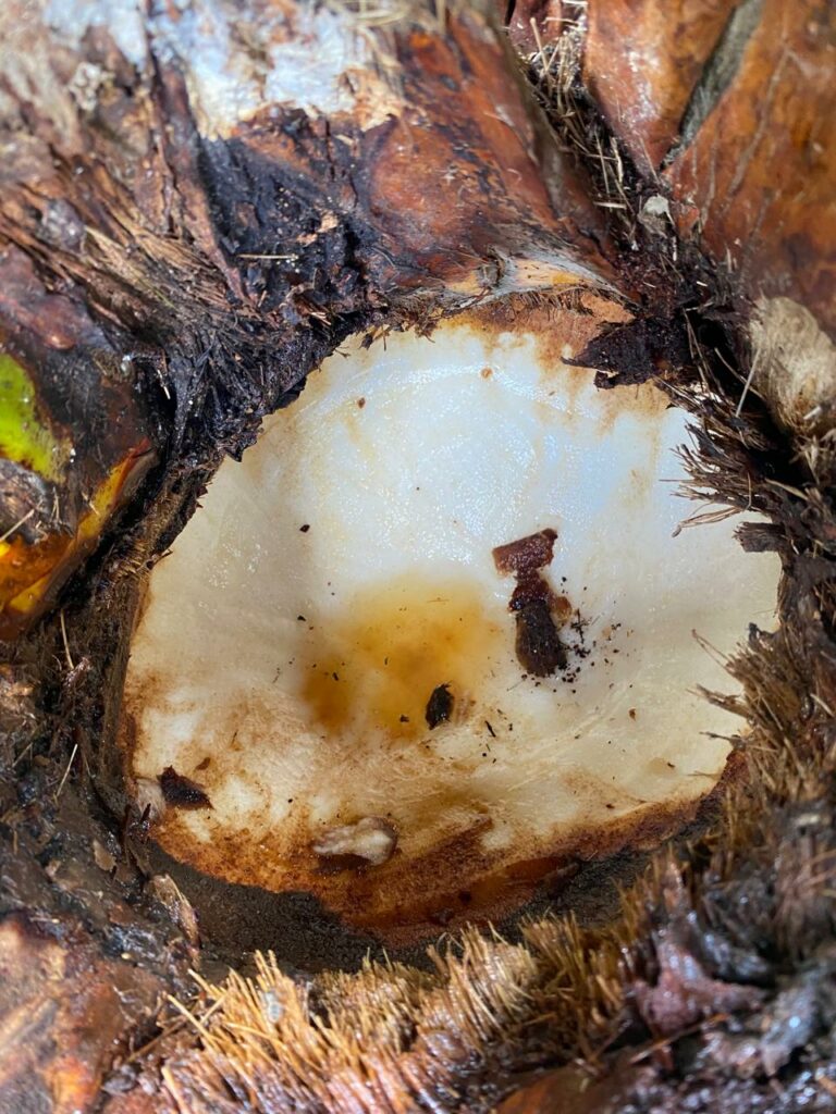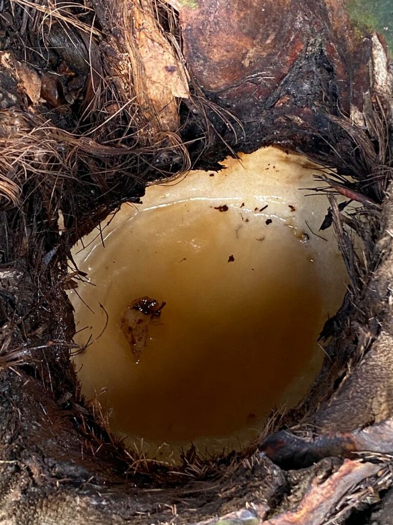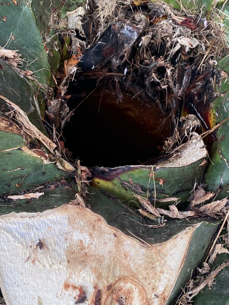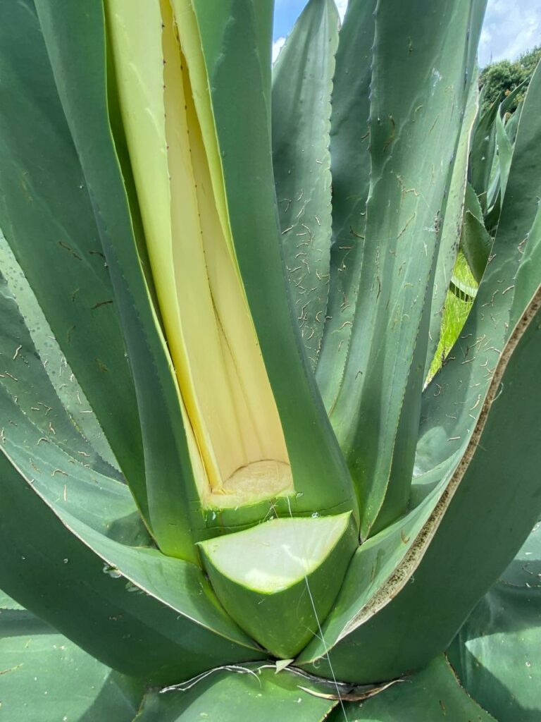 Cuando el maguey está maduro, el tlachiquero procede a “caparlo”, es decir, que corta la penca que se erige sobre la piña y procede a rasparla hasta llegar a su corazón, formando una jícara en el centro.