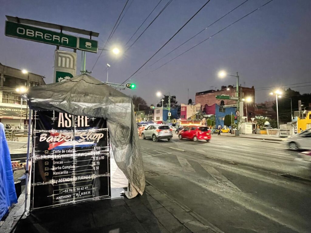 “Aquí piden mucho el mohicano y el taper“, explica Anthony, quien corta el cabello en un puesto de lona y varillas en el cruce de Eje Central Lázaro Cárdenas y Dr. Arce, a las afueras del Metro Obrera.