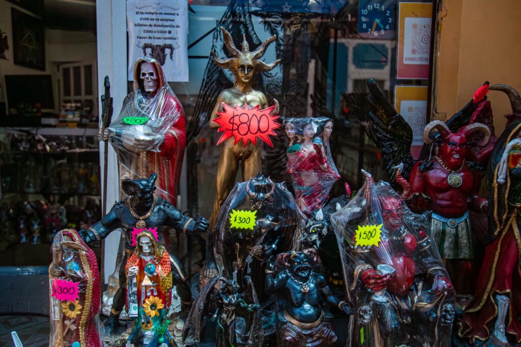 A unos pasos se encuentra la tienda esotérica de Alexis, donde vende incienso, pentagramas, pulseras y collares. También hay figuras de distintas deidades, en varios tamaños y precios, entre ellas Baphomet, Lilith y la Santa Muerte.