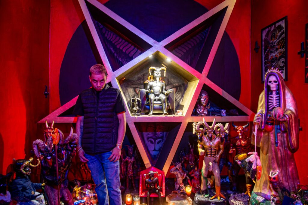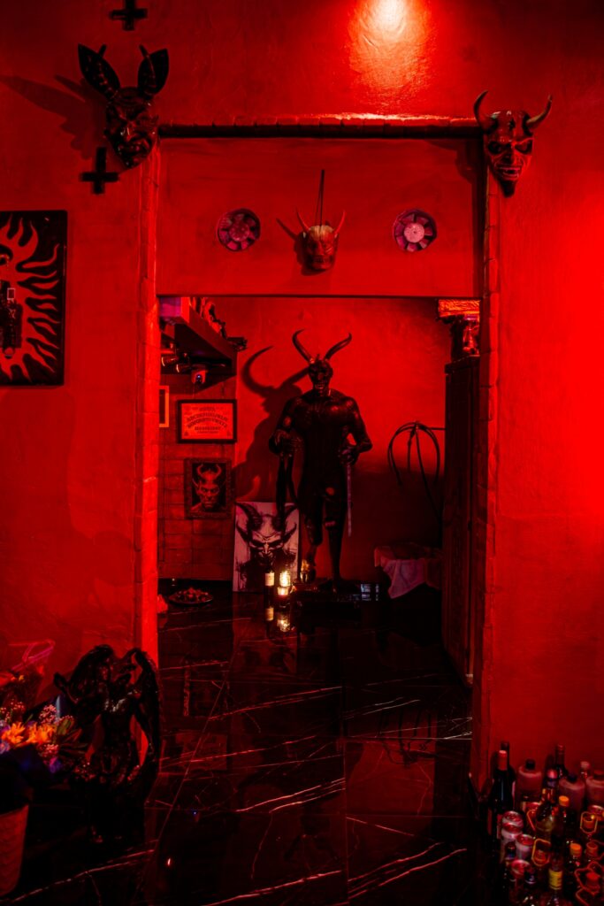 La capilla es pequeña y está envuelta en una luz roja que le da una atmósfera densa, casi hipnótica. El espacio se divide en tres cuartos: el principal, donde se ubica el altar al Ángelito Negro; un segundo con estatuillas de otras representaciones de Lucifer, y un último, muy reducido, dedicado a una escultura de la Santa Muerte.