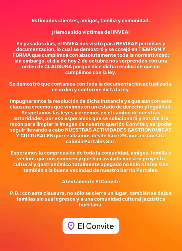 De acuerdo con el mensaje y con notas periodísticas, los dueños de El Convite afirmaron que impugnarán la resolución del Invea.