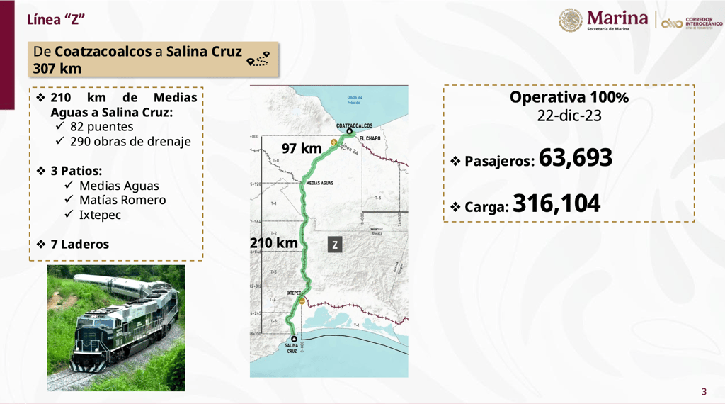 - Incluye 82 puentes ferroviarios, 290 obras de drenaje, patios de Medias Aguas, Matías Romero e Ixtepec, y siete laderos.