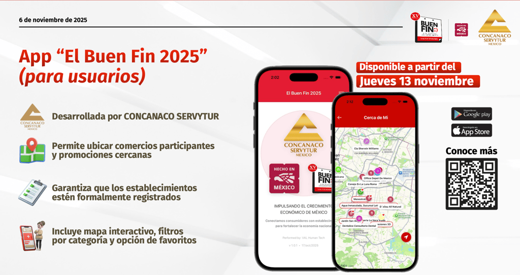 “A partir del 13 de noviembre va a estar disponible una aplicación, una app, El Buen Fin 2025, donde la comunidad podrá descargarla y visualizar las promociones también en el portal elbuenfinconcanaco.com.mx”, explicó.