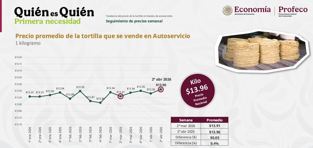 El precio del kilo de tortilla y de otros productos de la canasta básica se mantiene sin grandes cambios, de acuerdo con el reporte más reciente de la Procuraduría Federal del Consumidor (Profeco), presentado este jueves 16 de abril. Esto ocurre en un contexto donde la inflación sigue bajo presión por factores estacionales, especialmente en alimentos.