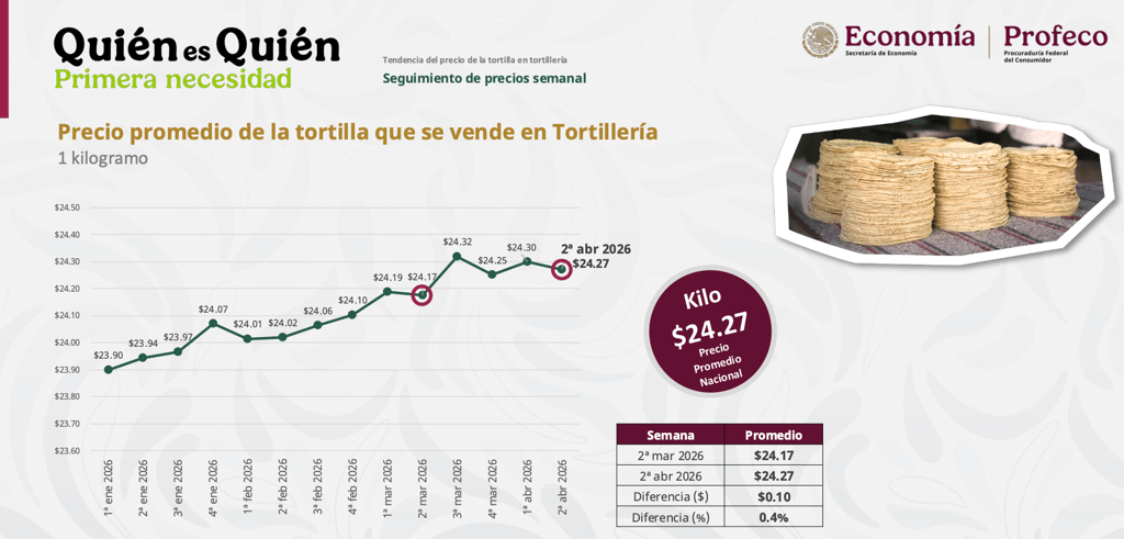 En tortillerías, el precio promedio nacional del kilo de tortilla está en 24.27 pesos, con una variación mínima de apenas 10 centavos respecto a marzo, equivalente a un cambio de 0.4%.