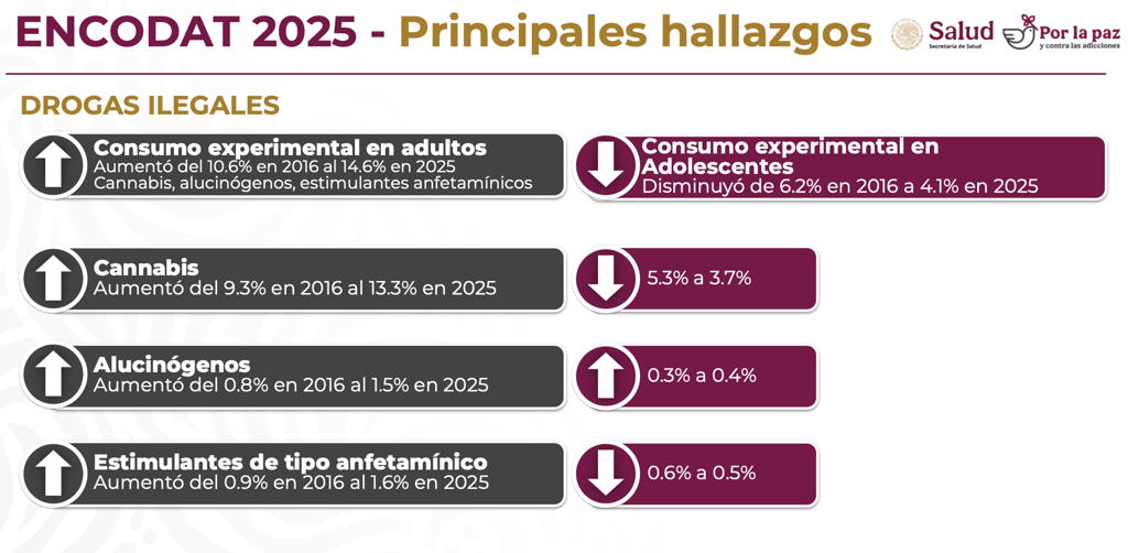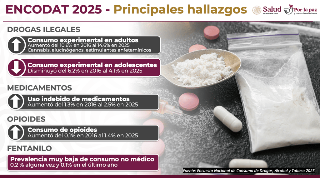 El documento elaborado por el Instituto Nacional de Salud Pública (INSP) de la Secretaría de Salud (SSa) revela que, el consumo de drogas ilegales de forma experimental entre adultos incrementó del 10.6% en 2016 a 14.6% en 2025, desde cannabis, alucinógenos y estimulantes anfetamínicos