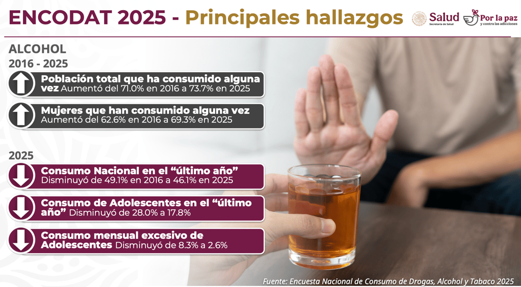 Respecto al consumo de alcohol en adolescentes, la reducción también se registró el último año, al pasar de 28% a 17.8%; en mujeres, esta cifra se incrementó de 62.6% en 2016 a 69.3% en 2025.