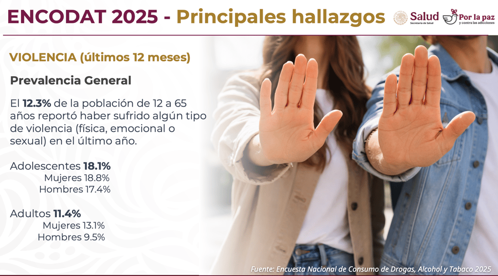 La presidenta Claudia Sheinbaum resaltó que los resultados de la Encuesta Nacional de Consumo de Drogas, Alcohol y Tabaco (Encodat) 2025 demuestran el éxito de la campaña preventiva, nacional y permanente “Aléjate de las drogas. El fentanilo te mata”, ya que el consumo de esta droga bajó de 0.2 a 0.1%, mientras que el uso experimental de drogas ilegales en adolescentes se redujo de 6.2% a 4.1%.