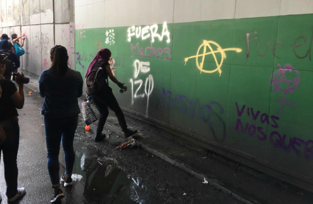 Previamente los encapuchados realizaron pintas en el bajopuente de Paseo de la Reforma y Eje Central Lázaro Cárdenas y el Museo del Tequila, ubicado en la Plaza Garibaldi, durante la marcha conmemorativa.