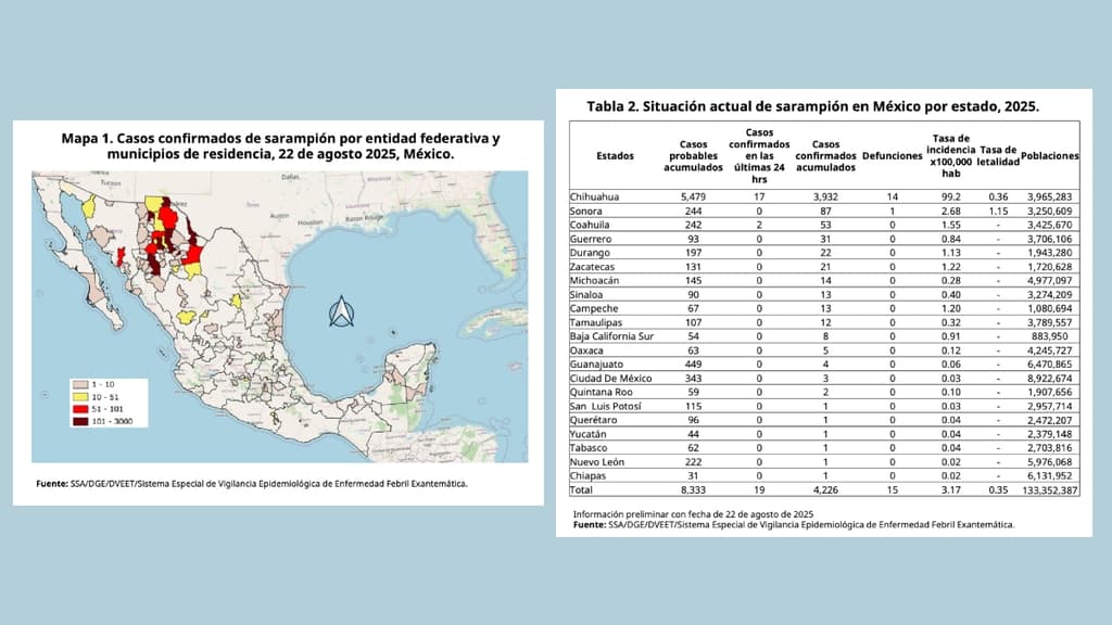 Se han reportado 4,226 casos de sarampión confirmados y acumulados en México, con 19 nuevos casos en las últimas 24 horas, según el Informe Diario del Brote de Sarampión en México, 2025 (publicación del 22 de agosto).