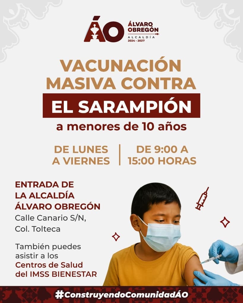 Se realizará una jornada de vacunación masiva contra el sarampión para menores de 10 años en la entrada de la alcaldía Álvaro Obregón. Las vacunas se aplicarán de lunes a viernes, de 9:00 a 15:00 horas, en la calle Canario s/n, colonia Tolteca, con el objetivo de mantener sanos a las y los pequeños.