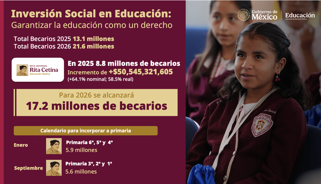 Al igual que en secundaria, la Beca Rita Cetina para primaria otorgará un apoyo económico de $1,900 cada dos meses durante el ciclo escolar.