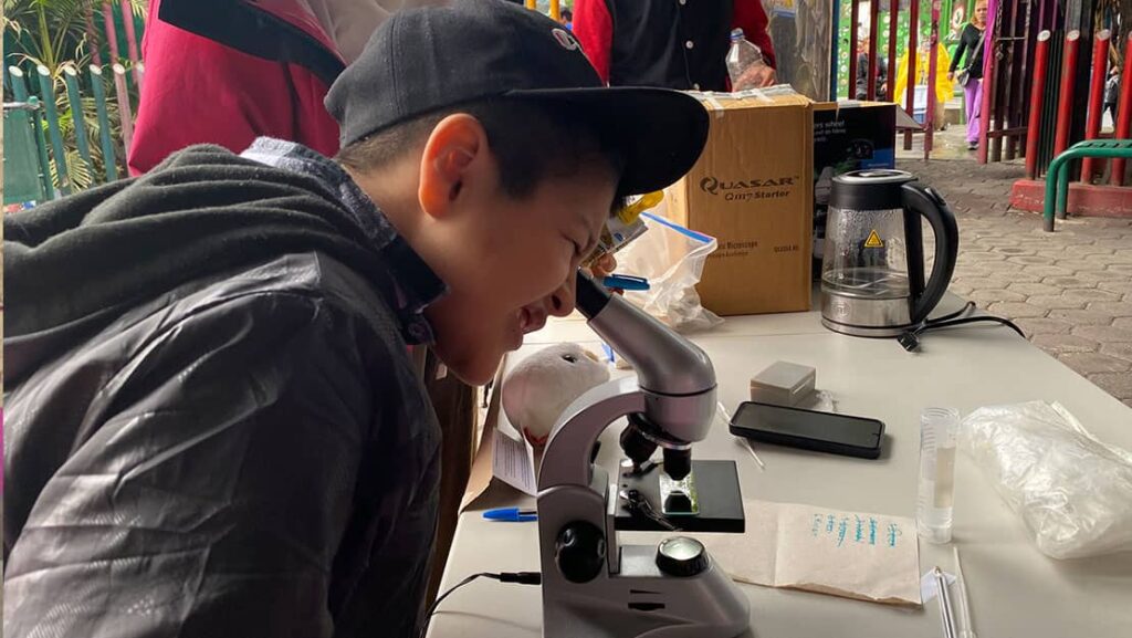 Génesis, una niña de ocho años, lanza un grito de sorpresa y emoción cuando el globo de su matraz estalla; se infló tan rápido que explotó causando un sonido seco. Entre risas, la gente comenta que “huele raro”. “Es el olor de la levadura”, aclara Angelina. Y también explica que ese pequeño ser vivo es un hongo y, gracias a él, es posible tener alimentos como el pan. Para cerrar el taller, Angelina invita a las niñas y niños a pasar al microscopio para mirar a la “levadura” en caja de Petri, mientras les reparte panes de dulce.