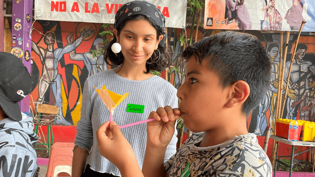 En uno de los talleres, mientras exploran el Principio de Bernoulli —que explica cómo un fluido (como el aire o el agua) disminuye su presión al acelerarse y la aumenta al ir más lento—, niñas y niños anotan la metodología y pasan rápidamente a la acción.
