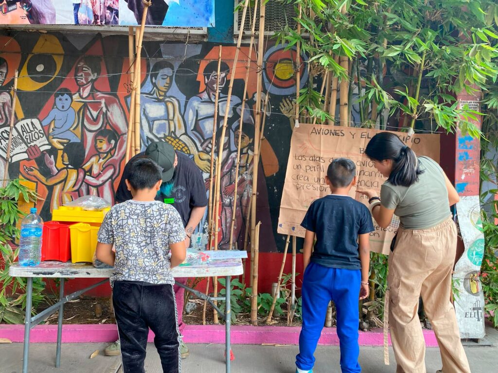 Poco después de las dos de la tarde, niñas y niños comienzan a llegar al foro. Dereck Mendoza, de once años, llega corriendo. Él ayuda a su mamá a vender “gorditas, flautas y, a veces, quesadillas” en un puesto ubicado muy cerca de la Telesecundaria 91. Él empezó asistir a los talleres de Puentes de 100cia desde hace año y medio. Su amigo, lo invitó: “Me convenció porque desde un inicio, yo quería aprender y ver más cosas”.