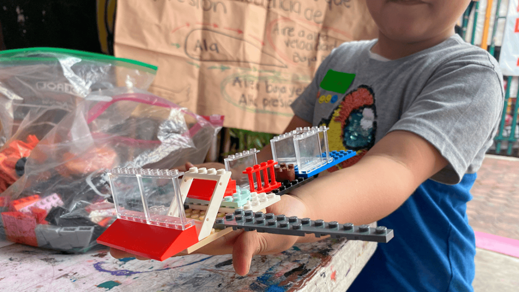 Primero cortan una hoja de papel en círculo y luego una parte a la mitad para formar un cono; le pegan un popote debajo de la punta y lo acoplan para hacer volar una bola de unicel. Al terminar, se dirigen a un módulo interactivo para comprender mejor este principio y responder a la pregunta: “¿Por qué vuelan los aviones?”. Además, construyen su propia versión de un avión usando piezas de LEGO.
