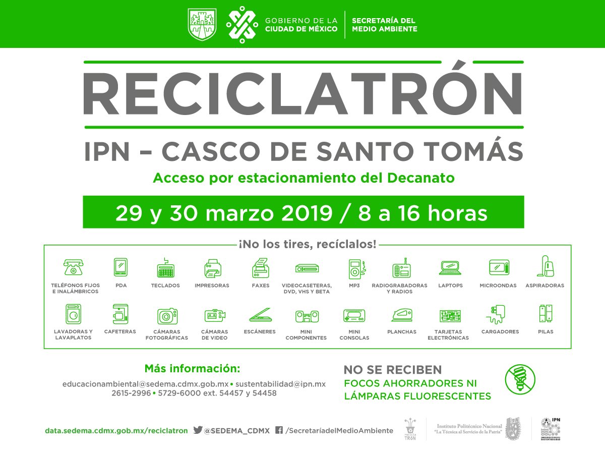 Pero ojo, no puedes llevar ni lámparas fluorescentes ni focos ahorradores, pues se consideran residuos peligrosos. En esta ocasión el Reciclatrón se realizará en el Casco de Santo Tomás del IPN.