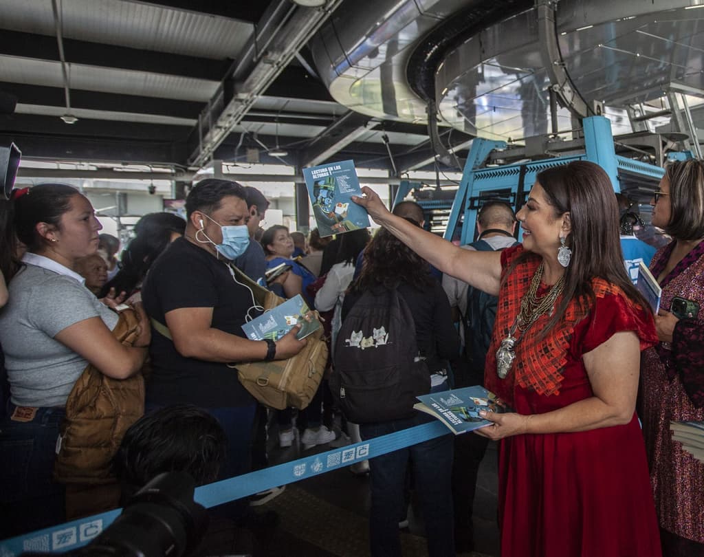 Además, con el apoyo de promotores de lectura, se invita a las y los usuarios a tomar el libro que les llame la atención, leerlo durante su viaje y devolverlo al llegar a su destino.