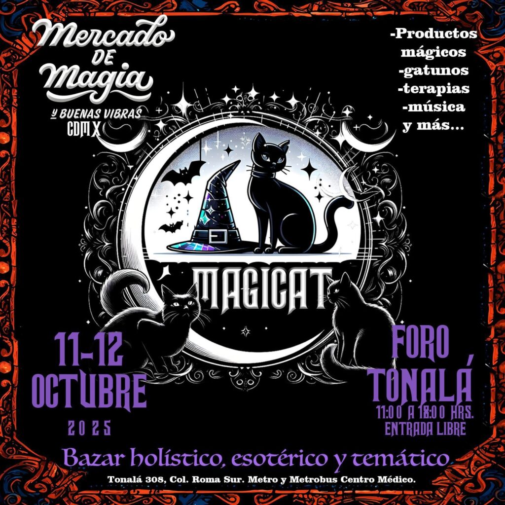 Si eres amante de los michis y lo esotérico, lánzate al Mercado de Magia y Buenas Vibras 2025 en CDMX, que este año celebra su 14va edición. Para conmemorarla, tendrá una temática especial para gatos brujos, el Día de Muertos y Halloween.