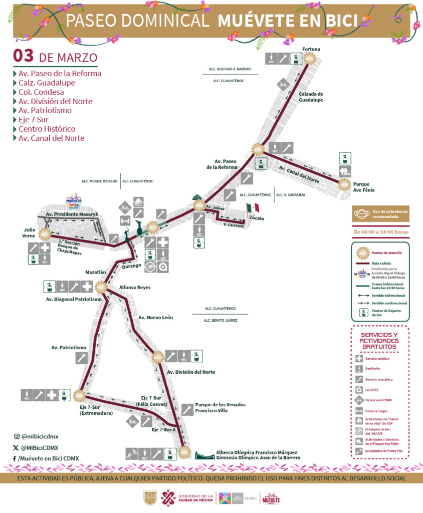 La ruta del paseo ciclista de este domingo 3 de marzo pasará por calles de la colonia Condesa y del Centro Histórico de la Ciudad de México.