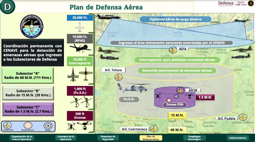 El operativo también contempla una estrategia de defensa aérea. Antes del Mundial se publicará en el Diario Oficial de la Federación un acuerdo para delimitar zonas de vigilancia del espacio aéreo en las sedes mundialistas.