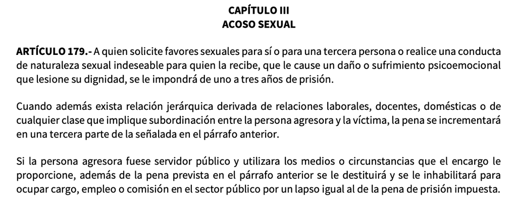 En la Ciudad de México, el acoso sexual está tipificado como delito penal. De acuerdo con el artículo 179 del Código Penal local, este delito se castiga con penas de uno a tres años de prisión, que pueden aumentar en caso de agravantes.